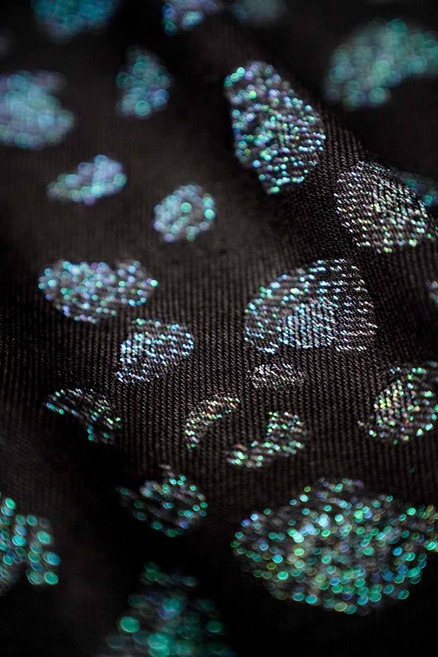 Einzigartiges Design: Die Safari Milo Babytrage kombiniert edles Schwarz mit grünen Glitzerfäden in einem atemberaubenden Leopardenprintmuster. Diese limitierte Edition ist ein echter Blickfang.