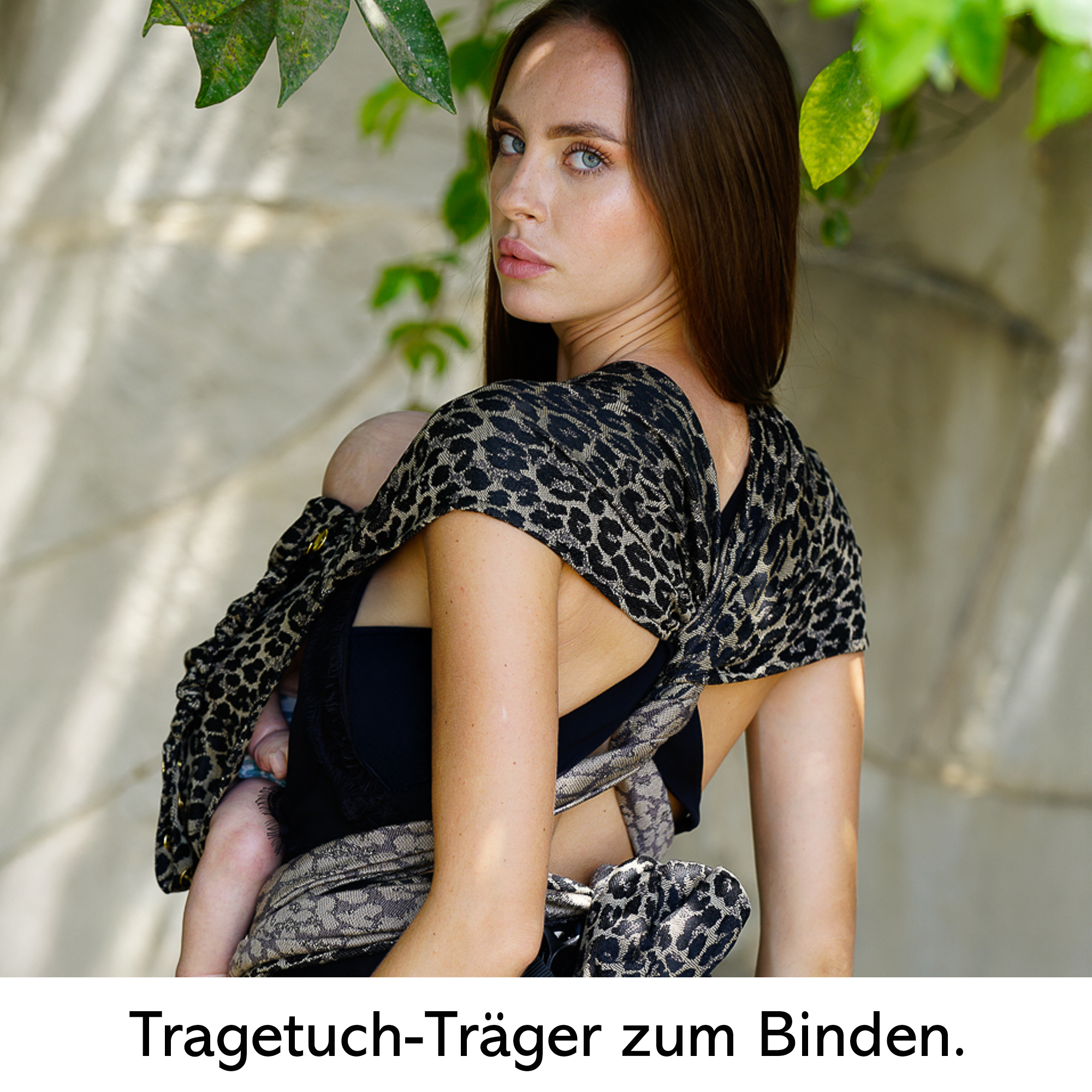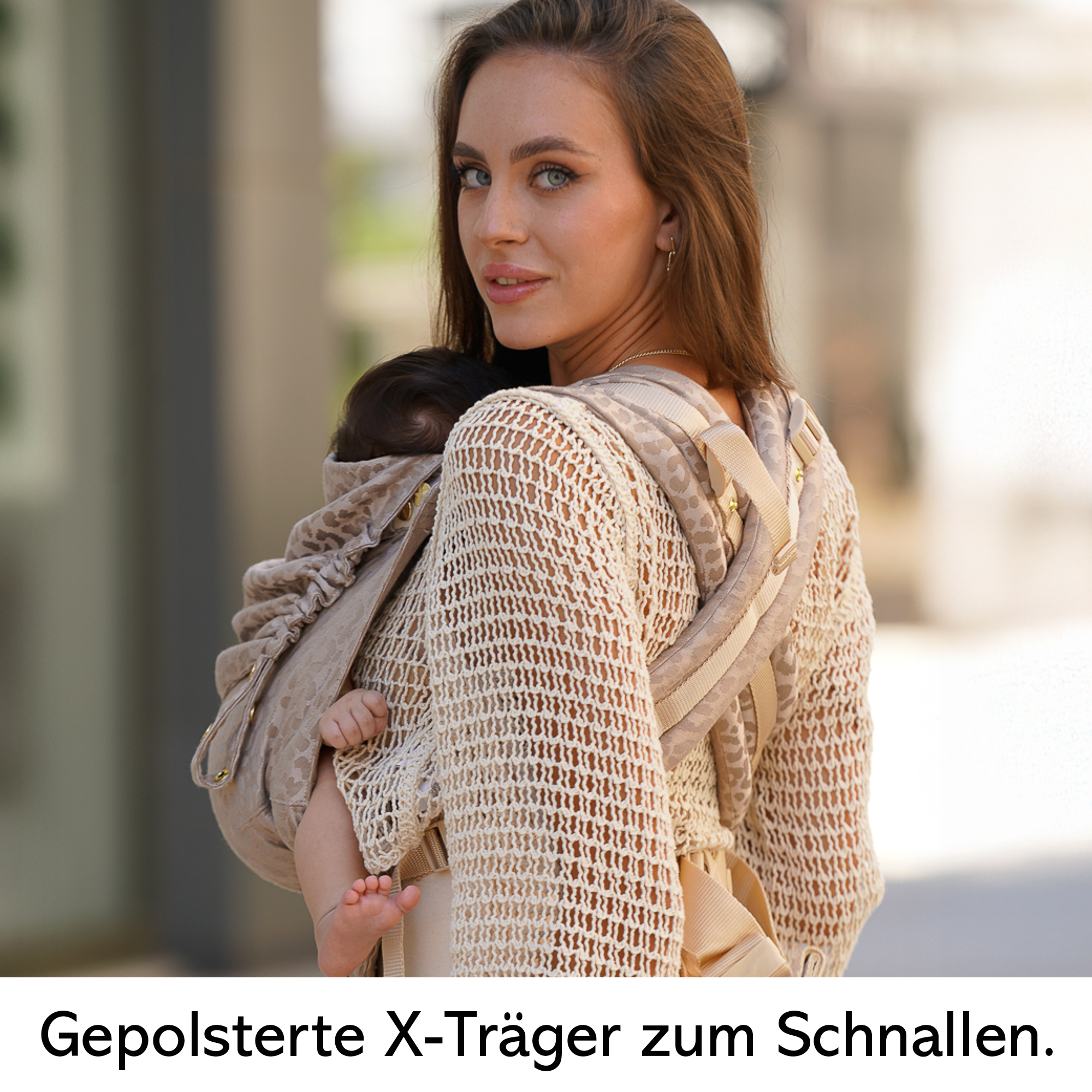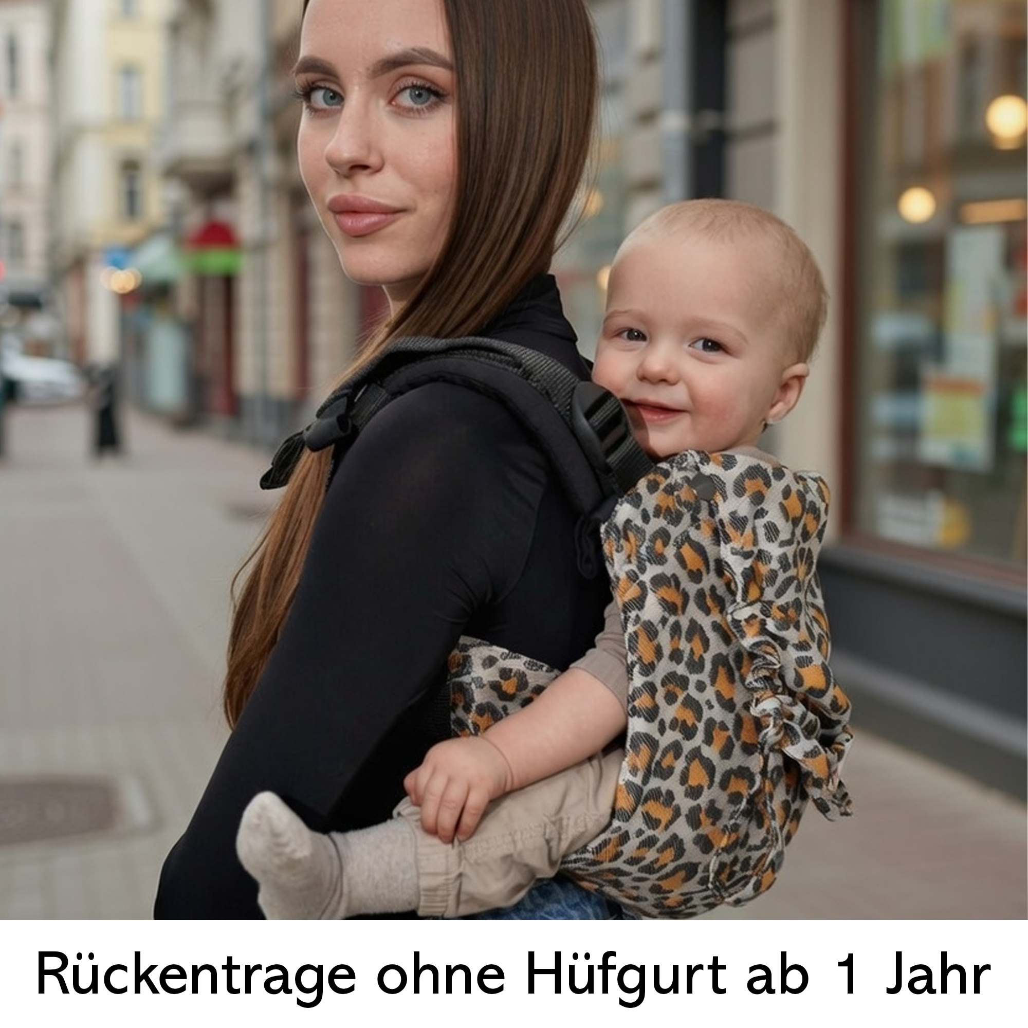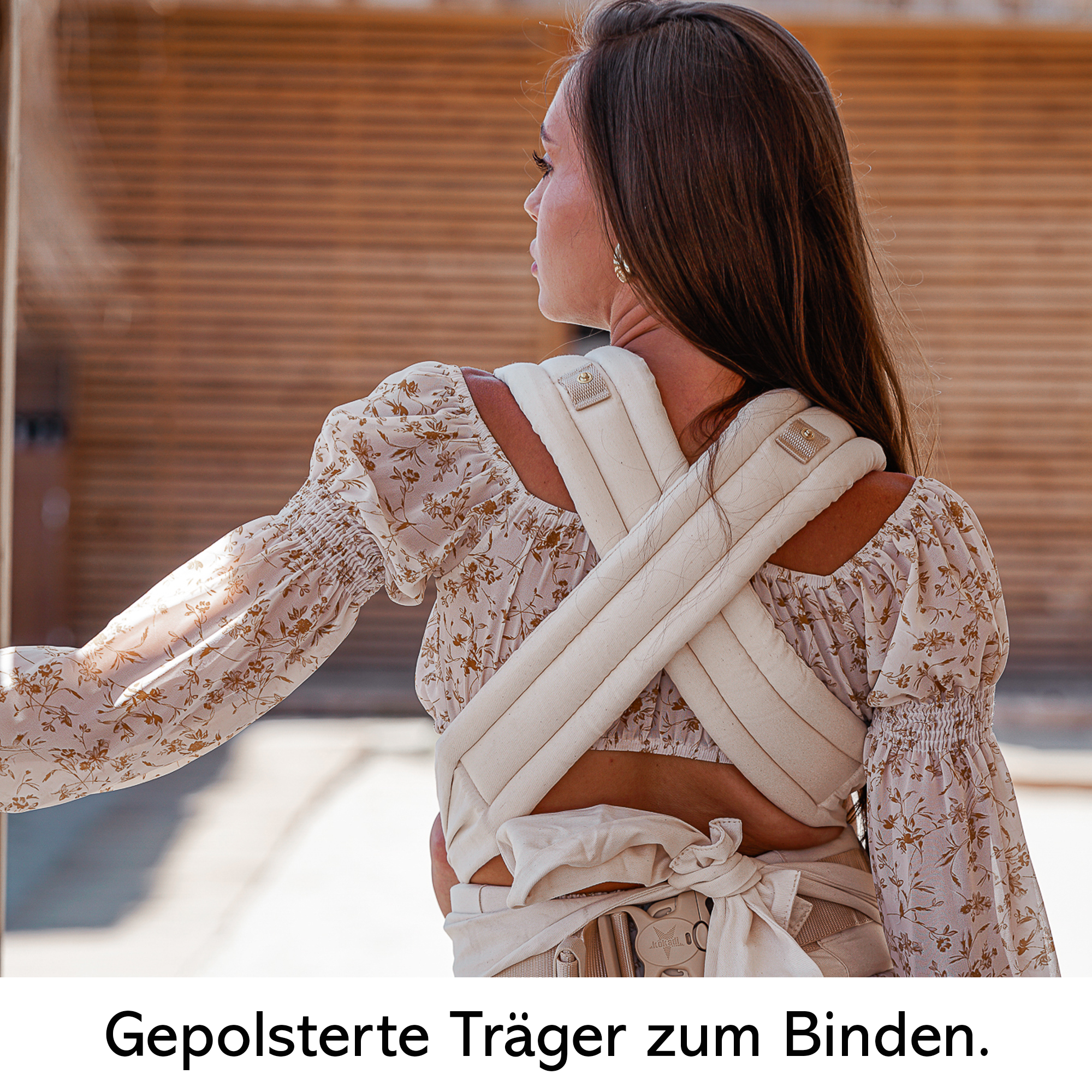 Dein Baby sitzt immer im gleichen, mitwachsendem Rückenpaneel aus Tragetuchstoff.
