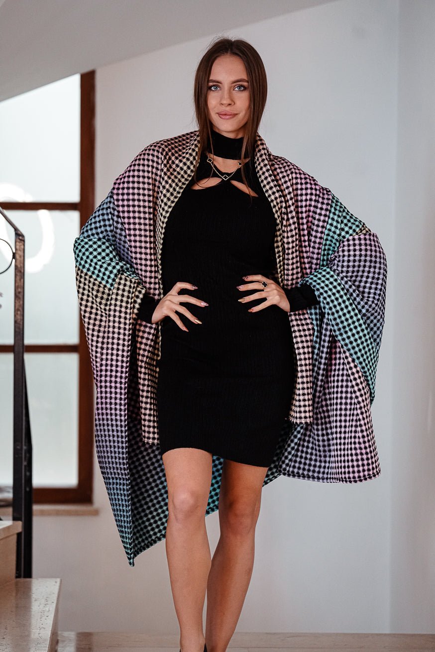 Mit sanften Pastell-Regenbogenfarben, die in die Tiefe sinken, und einem kontrastreichen Schwarz, das sich sanft darüber erhebt, entsteht eine dreidimensionale Struktur, die zum Greifen nah erscheint. Die Webart erzeugt ein einzigartiges haptisches Erlebnis – beim Berühren spürt man, wie sich die erhöhten Waben sanft unter den Fingerspitzen abzeichnen, während die vertieften Partien ein Gefühl von weicher, fluffiger Geborgenheit vermitteln.